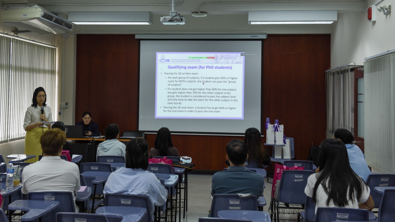 คณาจารย์ประจำหลักสูตรได้แนะนำรายละเอียดของหลักสูตรและการเรียนการสอน พร้อมทั้งแบ่งปันเคล็ดลับการเรียนที่มีประโยชน์ นอกจากนี้ยังได้อธิบายเรื่องสิทธิและหน้าที่ของนิสิต แนวทางการปฏิบัติตัวที่เหมาะสม จรรยาบรรณทางวิชาการที่สำคัญ รวมถึงระบบสนับสนุนการเรียนรู้ต่างๆ ที่วิทยาลัยฯ และมหาวิทยาลัย จัดเตรียมไว้ให้
