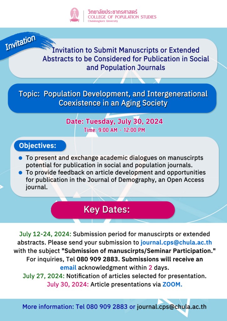 ผู้ที่สนใจส่งร่างบทความหรือมีบทคัดย่อขนาดยาว (Extended abstract) ที่สนใจตีพิมพ์ในวารสารกลุ่มสังคมและประชากรมาร่วมงานโครงการสัมมนาเพื่อเสริมศักยภาพการตีพิมพ์ในวารสารกลุ่มสังคมและประชากร เรื่อง การพัฒนาประชากร และการอยู่ร่วมกันระหว่างวัยในสังคมสูงอายุ และนำเสนอวันอังคารที่ 30 กรกฎาคม 2567 เวลา 9.00-12.00 น. เพื่อนำเสนอและร่วมแลกเปลี่ยนงานการศึกษา เพื่อร่วมสนับสนุนการเสริมศักยภาพการตีพิมพ์ในวารสารกลุ่มสังคมและประชากรและให้ข้อเสนอแนะในการพัฒนาบทความและมีโอกาสตีพิมพ์ใน "วารสารประชากรศาสตร์" ซึ่งเป็นวารสาร Open Access และเป็น Tier 1 ในฐาน TCI